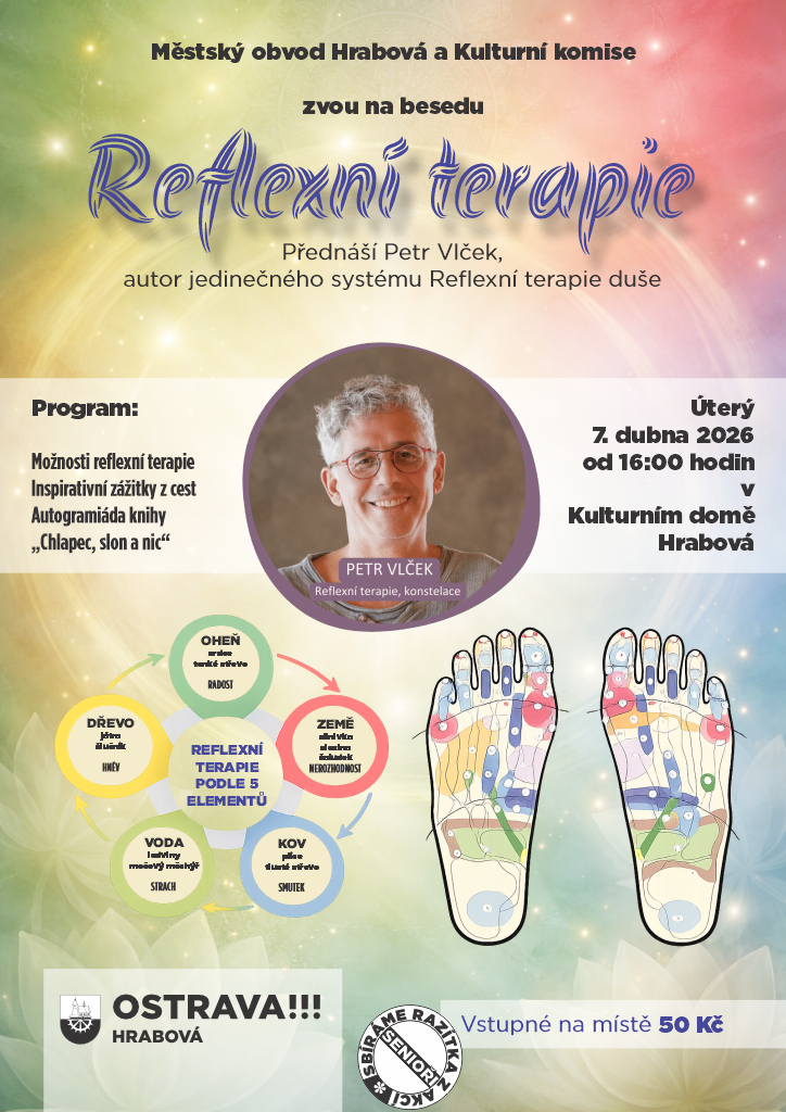 Městský obvod Hrabová a Kulturní komise Vás srdečně zvou na besedu Reflexní terapie s přednášejícím Petrem Vlčkem, autorem jedinečného systému reflexní terapie duše. Dozvíte se více o možnostech reflexní terapie, inspirativních zážitcích z cest i o osobních zkušenostech přednášejícího. Vstupné: 50 Kč (na místě). Všichni zájemci jsou srdečně zváni.