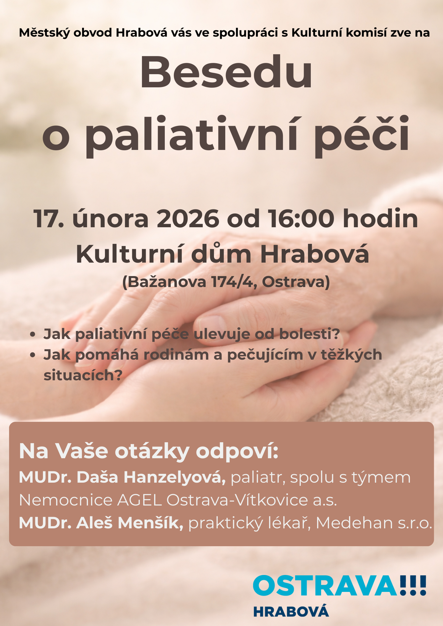 Městský obvod Hrabová Vás ve spolupráci s Kulturní komisí srdečně zve na besedu o paliativní péči, která se uskuteční v úterý 17. února 2026 od 16:00 hodin v Kulturním domě Hrabová (Bažanova 174/4, Ostrava). […]